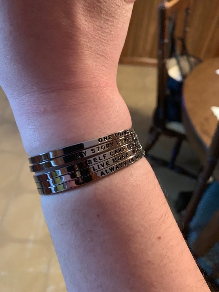 When wearing my Mantras, I try to wear ones that I will need to hear that day. For instance, if I need to feel like my mom is near me, I wear Always In My Heart. Or, if I want to remind myself it’s important to take care of myself, I wear Self Care Is Not Selfish. I love these bracelets because of their message, and they make great gifts to those who are going through something.
