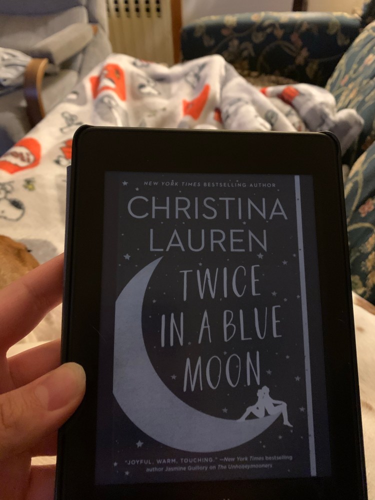 Current/Recent Reads: On Sunday, I finished Twice in a Blue Moon by Christina Lauren, and I loved it. Christina Lauren is one of those authors that has become an auto-buy for me. Twice in a Blue Moon is definitely up there with my other favorite, My Favorite Half-Night Stand. It is about Tate, who mets Sam when she is on a trip to London when she was 18 years old. The two fall in love and she shares her secret — that she is the daughter of a famous actor. A few days later, he leaks her secret and it turns her life upside down.