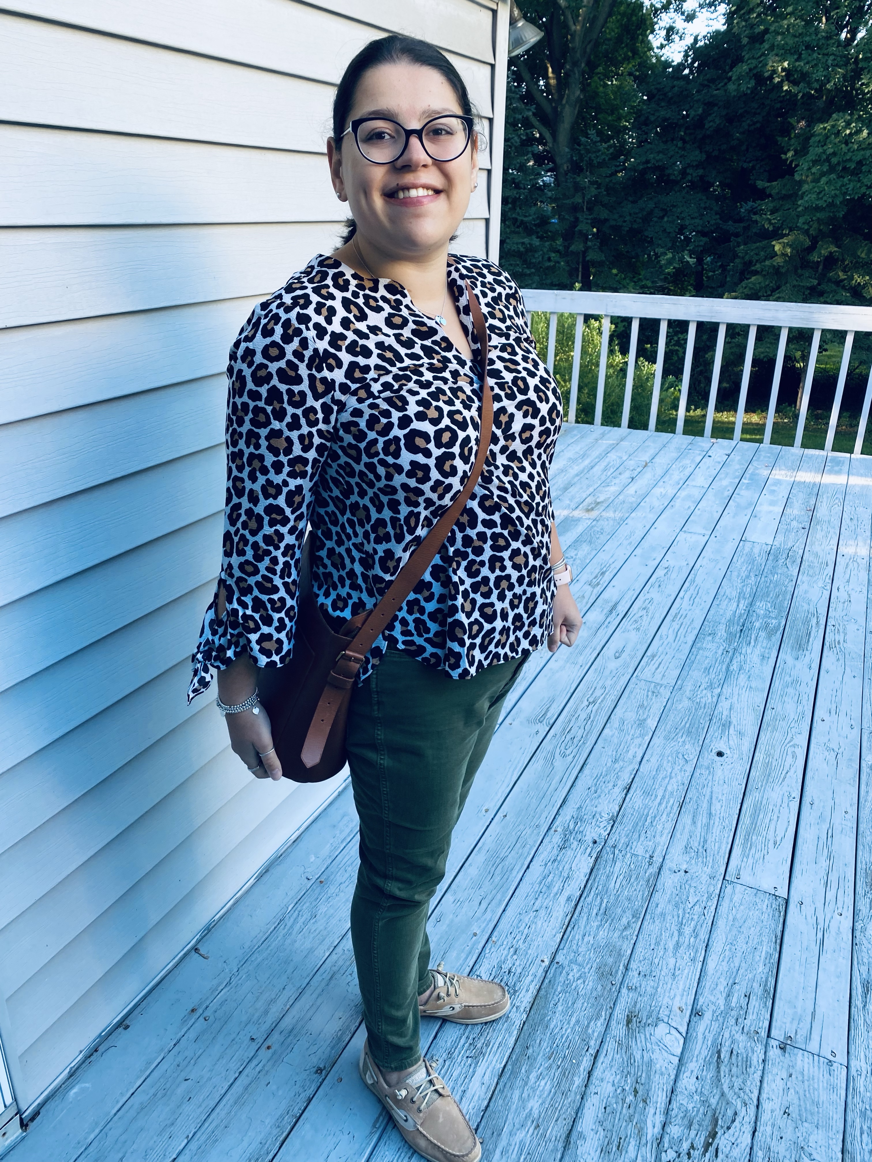 Now, leopard print is something that can be tricky to style. I tried them with a pair of olive pants, and I was obsessed with it. I can also see myself wearing this top with jeans for a more casual vibe, leggings (leggings go with just about everything), and black pants.