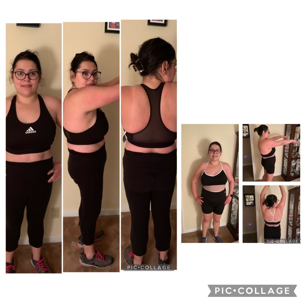 Okay, so now let’s get to the good part. The results. I have started to lose some weight and inches throughout my body. That said, I’ve shared my first check-in day photo with my most recent one. I notice that there is more muscle mass in my arms, and my stomach is flatter.