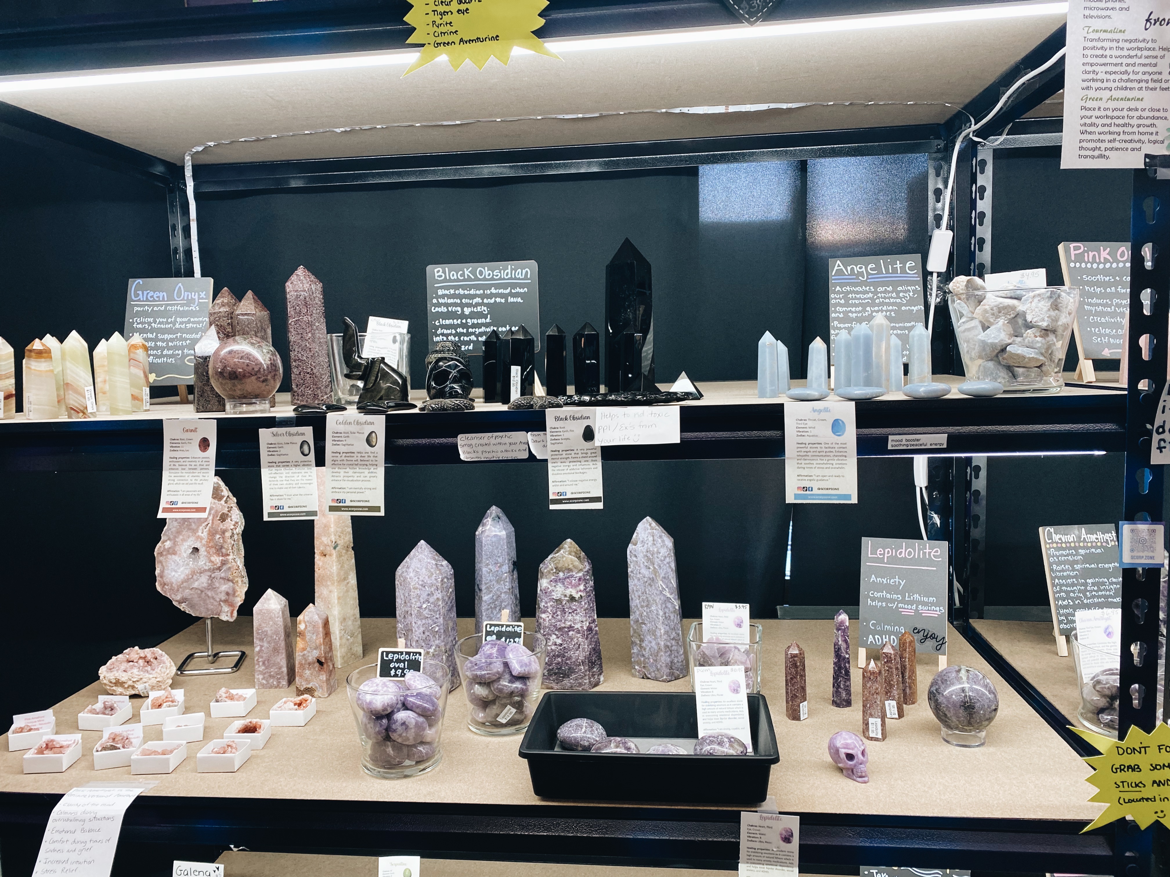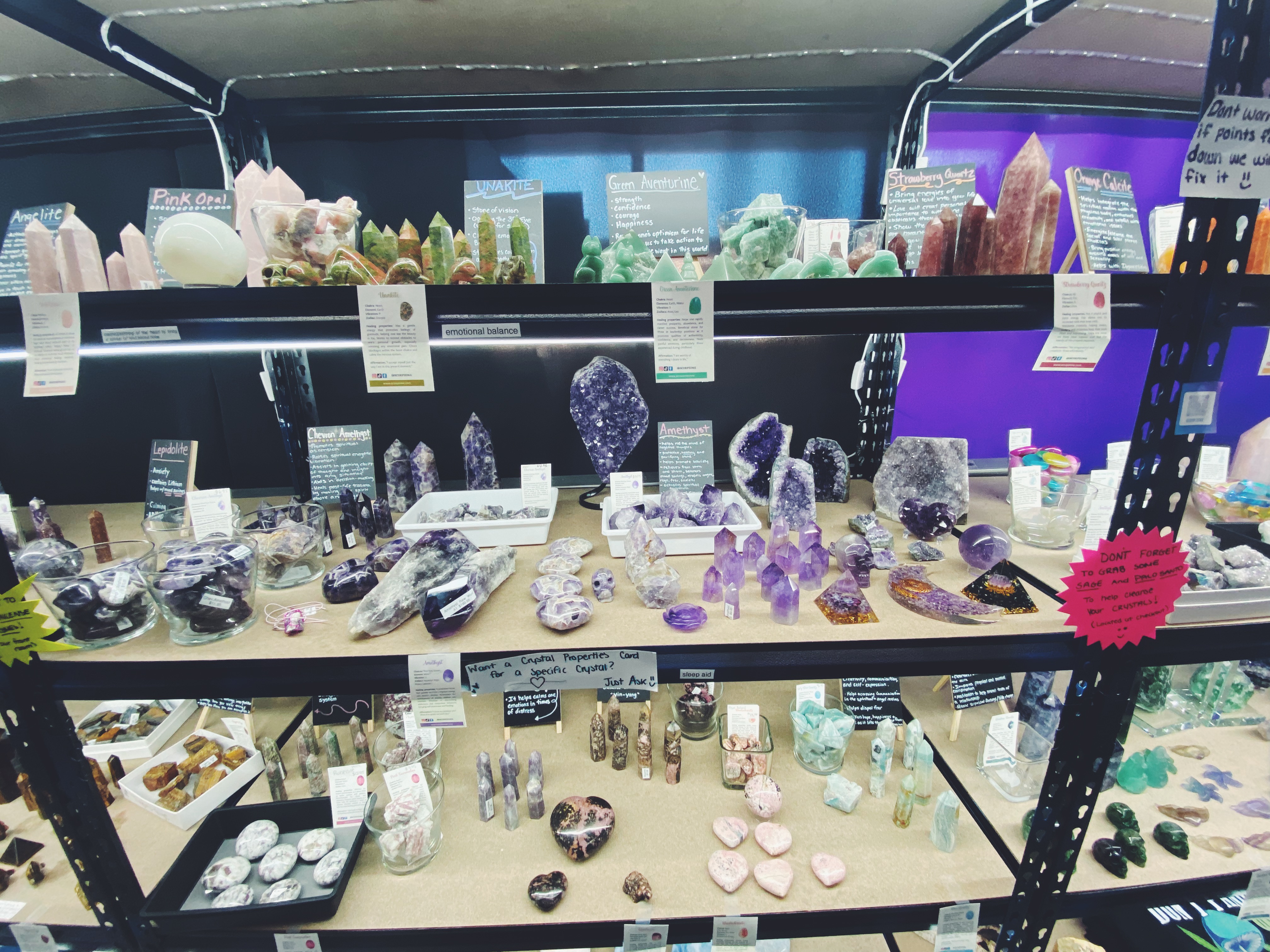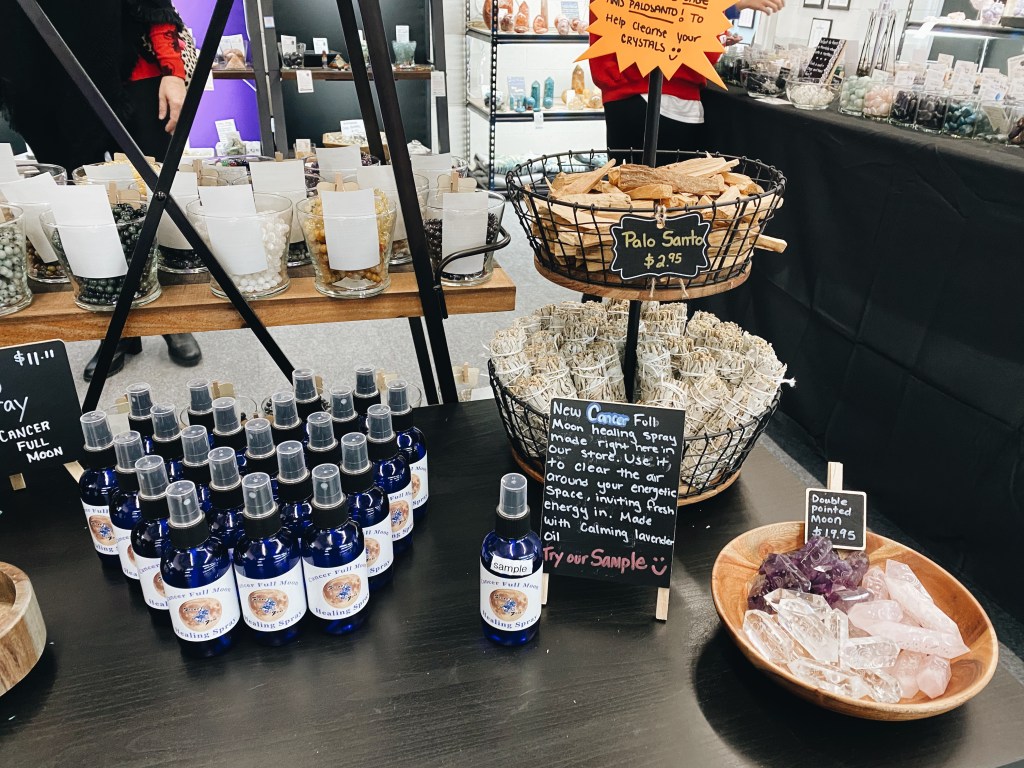 Then, as you go into the crystal room, you are greeted by every kind of stone that you can think of — from amethyst to opalite, and everything in between. Oh, and all of the colors of quartz that you can possibly think of. Crystals come in every size, from tiny ones that can be fit in pockets to larger sizes for display. Additionally, the shop offers a wide variety of jewelry, clothing, healing spray, selenite bowls, and kits that have every intention that can assist with any kind of struggle.