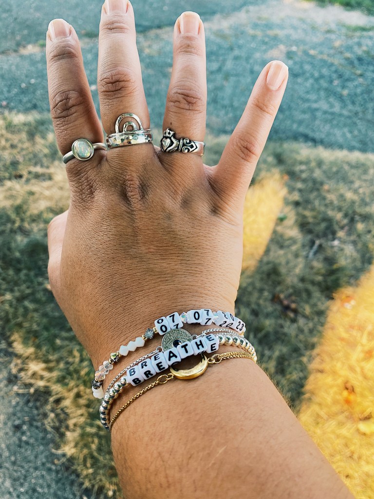 Monday was a day of introducing new pieces and playing around with them. I purchases these comfy pants off of Amazon, and I love having a khaki option to mix around with all of my black pieces. Last Sunday, my fiancé and I went to a TJ Maxx, where I picked up this Calvin Klein dress shirt. I also paired it with an off white Madewell cardigan (here’s a similar one here), which has been on my wardrobe for the last few years. And of course, I paired this with a T Jazelle Stack which consisted of the Evil Eye, the Sunflower, the One Step at a Time, and the Moonstone Cancer).