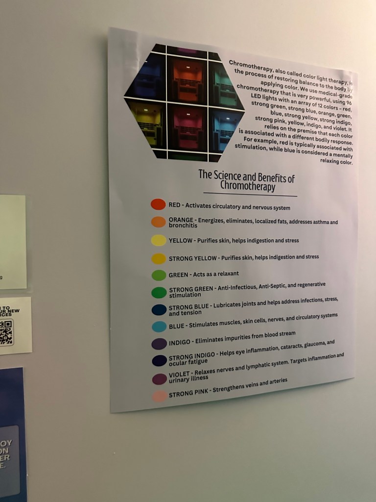 What I thought was really cool was the fact that they had the option for Bluetooth speakers to allow for any kind of audio, such as music, podcasts, or even YouTube videos. To further set a relaxing tone before the experience, you are able to choose the color of the light in the booth based on what you need the most healing for, and can change it through the 20-minute experience as desired. We started off with the green, which helps relaxation, then continued to the blue one, which stimulated the circulation system, and ended with violet, which assists with relaxing the nerves and the lymphatic systems.