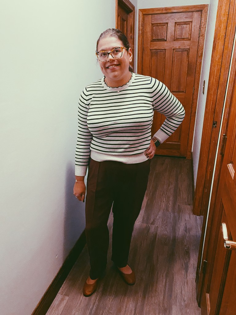 It was raining on Tuesday, so my outfit pictures had to be done inside. Today was a simple day — a striped Banana Republic Sweater from a few years back, followed by a pair of Pintucked Taper Pants from Loft. I also had on the same shoes as I did the day before. Since the sweater from the Banana Republic outlet is on the older side, here is a link to a similar one.