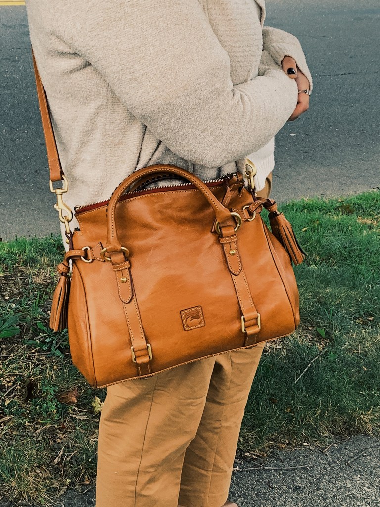 Before we get into that, let’s talk about my bag, because I love this bag for fall. It is the Dooney and Bourke Florentine Satchel in Natural. And, I got it for such a steal at my local outlet last year, where I only paid $150 when the bag is over $500. Around this time of year, Dooney does run a tent sale that may or may not happen, so I suggest checking out your local Dooney and Bourke Outlet.