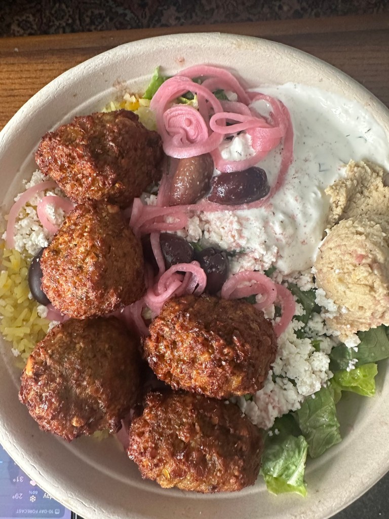 Right now, my go-to on the menu is a pita with grilled chicken, lettuce, onions, and tzatziki sauce. That is my go-to because their ingredients are so fresh and delicious. I’ve also had their Falafel — which was my first time having it — and it was absolutely amazing. They had a little kick of spice of them, but did not lack flavor. In addition, I’ve also tried their seasoned fries and they were absolutely delicious as well. What I liked about those is that those fries don’t taste overly salty. Instead they rely on natural flavors and seasonings. Perfect for this high blood pressure girly.